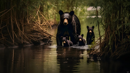 A Black Bear Mother and her Cubs in the River