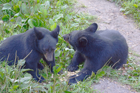 Summer capture of a pair of North American black bear cubs, playing together in a grassy habitat.
