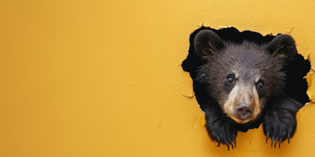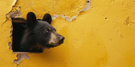 Close up view picture of the hollow yellow hole on the the wall that show the bear stay inside the wall that has been made from some material yet still can be break to look through other side. AIGX03.