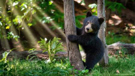 A small black bear cub climbing up a tree in the woods, AI
