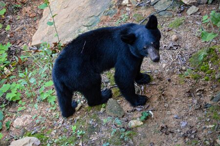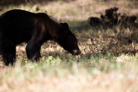 Young black bear (Ursus americanus) yearling foraging for insects and plants on the ground