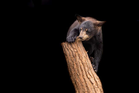 Young black bear climbs tree, forest sunset. Wildlife nature photography