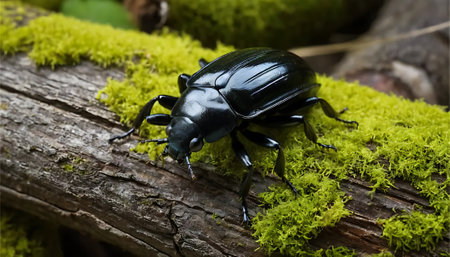 A striking black beetle crawls across a mossy log, bathed in soft light. The vibrant green moss contrasts beautifully with the beetle's sleek body, creating a serene and captivating image.