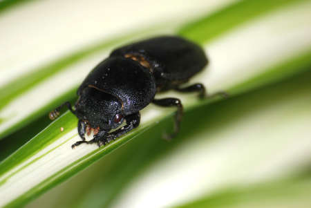Taiga beetle Sphaeritidae or ball beetle. a family of insects of the Coleoptera order, including one genus Sphaerites. selective focus.