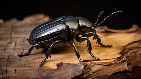 A black beetle ascends the rough texture of tree bark, showcasing its detailed anatomy. The background hints at a serene forest environment, ideal for nature enthusiasts.