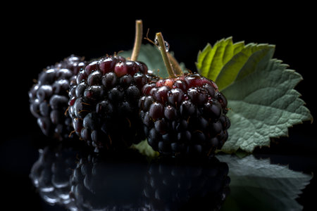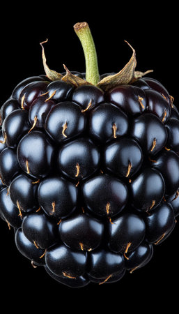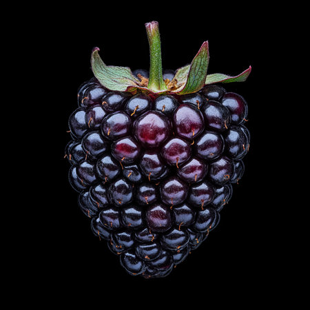 Ripe Blackberry, Glossy Skin, Isolated on Black Background. Vibrant Colors, Healthy Food..