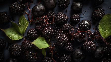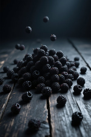 An AI generated illustration of freshly picked wet blackberries on a wooden surface