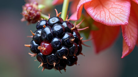 Close-up of black raspberry on stem with vibrant pink flower petals. That the image is generated using AI.