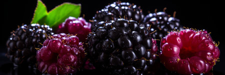 Boysenberries background banner. vibrant macro of delicious ripe berries for food and summer themes