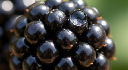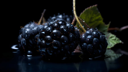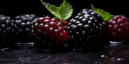 Discover the beauty of fresh blackberries glistening with water droplets, showcasing their rich texture and vibrant color, perfect for culinary inspiration and healthy snacking.