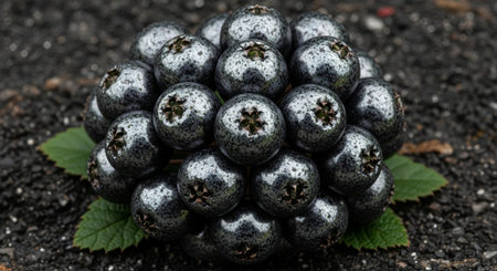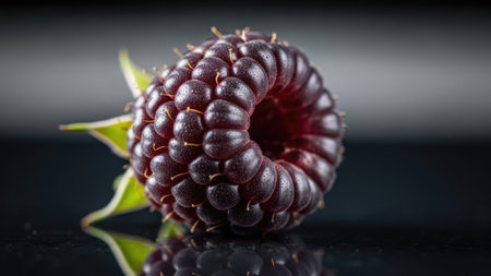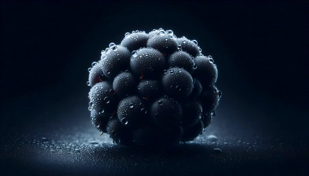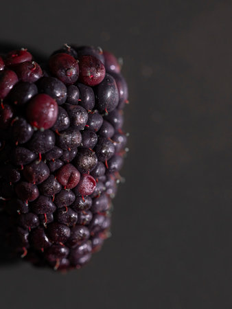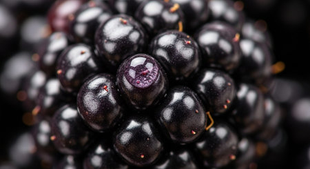 Blackberry drupelets in tight macro showing micro reflections on a graphite field professional texture photo for editorial food design and modern branding backdrops