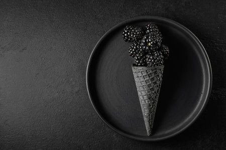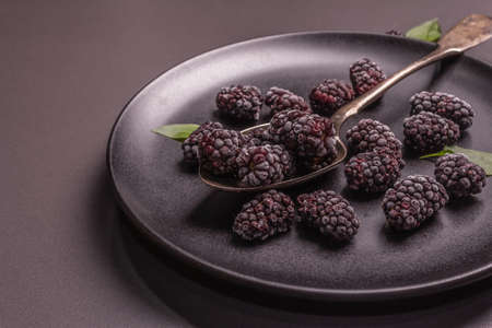 Plate with fresh and ripe blackberries ready to eat. Fresh fruit plate. Antioxidants in the kitchen. Food photography