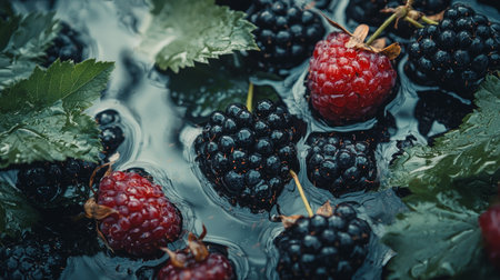 Close-up of fresh blackberries and raspberries floating in water alongside green leaves. Represents freshness, nature, and healthy food.