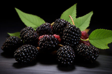 Vivid close-up of juicy blackberries, showing their deep purple hue and intricate detail. AI Generative