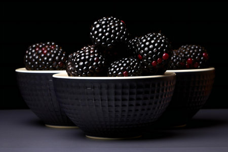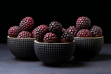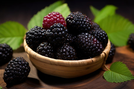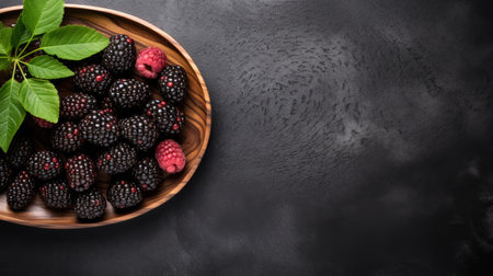black raspberries are showcased in a wooden bowl against a dark background, creating a captivating image with hints of dark magenta and dark gray. this innovative page design draws inspiration from the barbizon school, featuring polished concrete and bold black lines. the composition beautifully combines natural and man-made elements, exuding a unique selkiecore aesthetic. ai generated