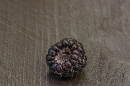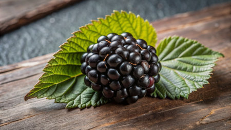 A macro shot highlights a single, ripe blackberry with a glossy, bumpy texture. Set against a soft, blurred wooden background, the fruit appears fresh, juicy, and ready to eat.