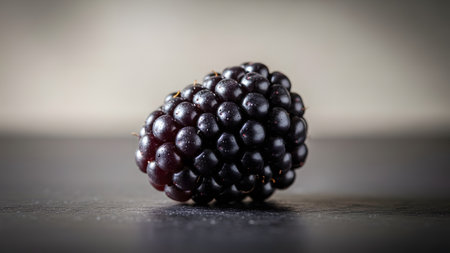 A studio macro shot of a single, ripe blackberry isolated against a grey gradient background with dramatic lighting. The close-up reveals the glossy texture of the individual drupelets, emphasizing freshness and quality.
