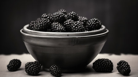 A stunning collection of fresh blackberries rests in a rustic bowl, set against a dark backdrop. This image highlights the natural beauty and rich textures of berries, perfect for promoting healthy eating and organic lifestyles.