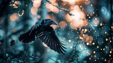 Crow flying in the night forest with bokeh background.