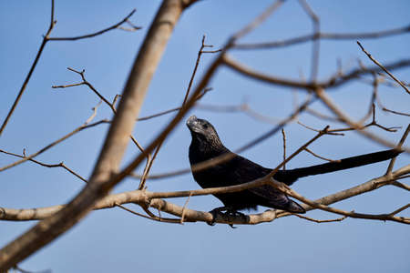 smooth billed ani, Crotophaga ani is a large near passerine bird in the cuckoo family, sitting on a branch of a tropical tree in the wetlands of the pantanal swamp, Brazil, South America