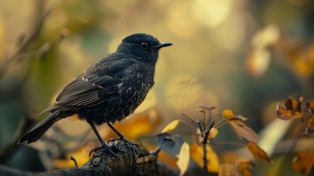 A black bird perches on a mossy log in a forest with yellow leaves