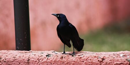 Black crow standing on a fence using its grapples while croaking with old bricks background