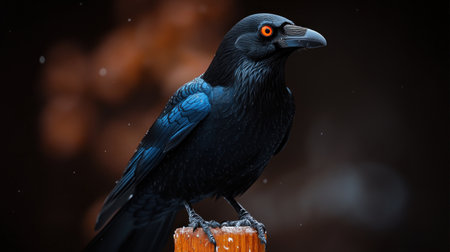 a black bird with yellow eyes captured in a contemporary portrait photography style. the image showcases a dark sky-blue and orange backdrop, highlighting the bird's sharp and clever humor. the photograph also incorporates elements of hyperrealistic marine life, drawing inspiration from the dusseldorf school of photography. with minimal retouching and the technique of focus stacking, this image captures the bird's intricate details with stunning clarity.