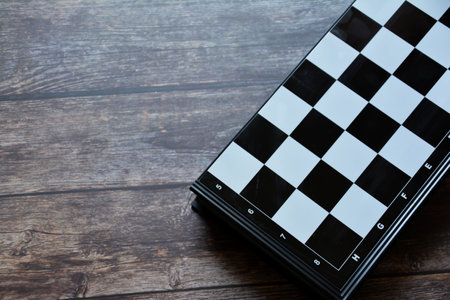 A blank school chalkboard or slate on a wood panel background with a piece of white chalk, with copy space