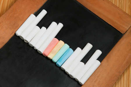 White wooden frame with chalk inside on blackboard, back to school background, primary education, kids creativity development, dark desk for drawing, art table, view from above, copy space for text