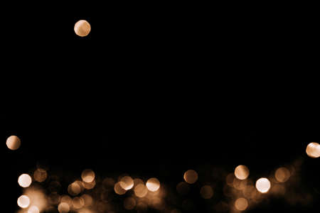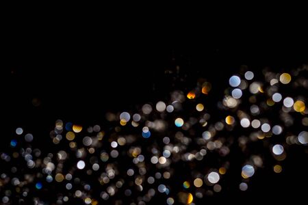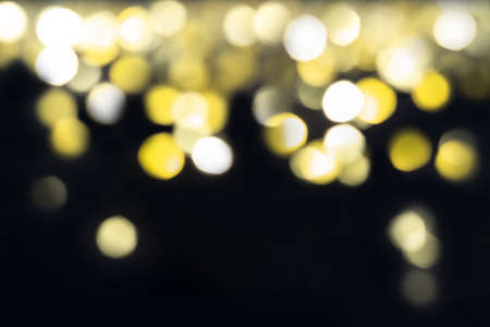 Abstract Night background with gold bokeh lights and place for text. Beautiful Festive textured background. Black and white lights.