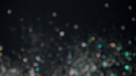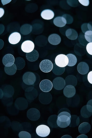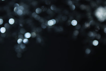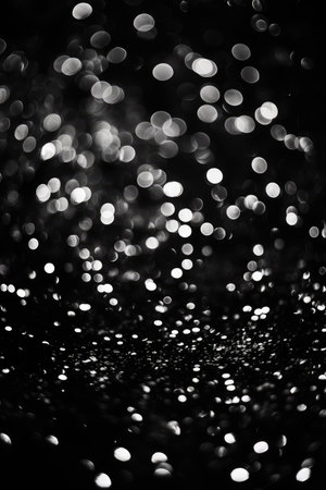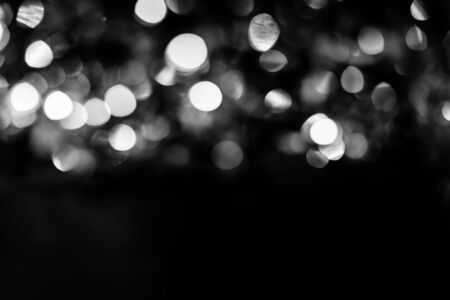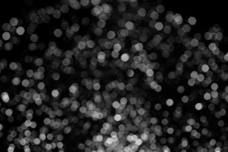 Black and white circles bokeh festive glitter dark background. Christmas lights bokeh overlay pattern. Modern abstract design.