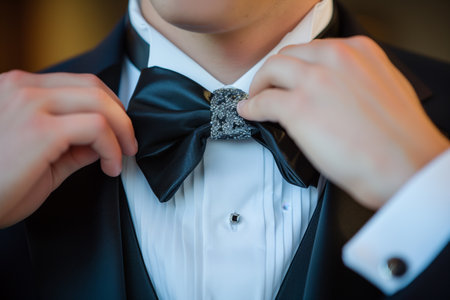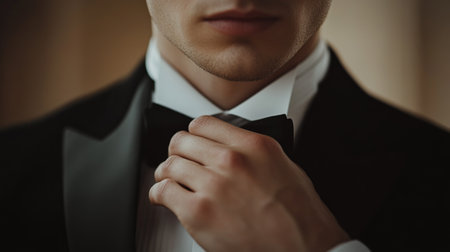 A man in formal attire is adjusting his bow tie, demonstrating elegance and attention to detail as he prepares for an important evening event or celebration.