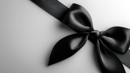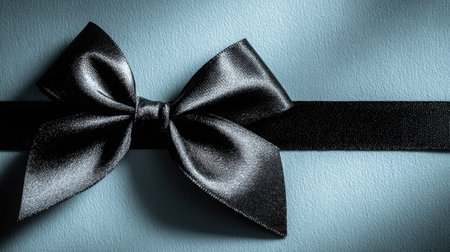 Black satin ribbon bow elegantly positioned on a pale gray surface, softly lit from the side, enhancing its texture and creating a refined visual appeal