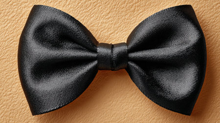 A sophisticated black satin bow is elegantly placed on a warm beige background, softly lit by natural daylight, perfect for celebrations or special events