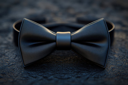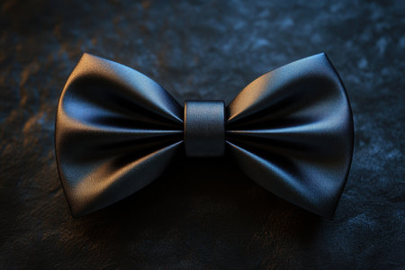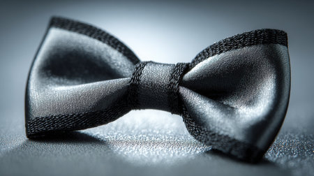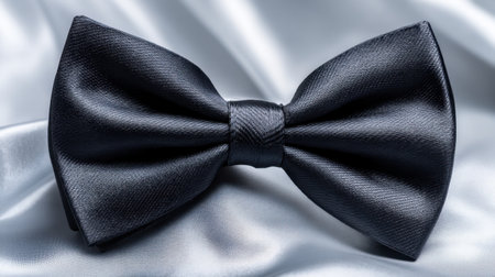 A sophisticated black satin bow tie lies on a smooth reflective surface, emphasizing its exquisite texture and elegance, perfect for formal occasions and stylish appearances.