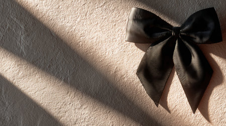 Black ribbon bow elegantly placed on a textured neutral surface, bathed in soft morning light, creating a serene and inviting atmosphere for various occasions