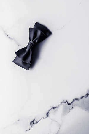 Holiday gift, decoration and sale promotion concept - Black silk ribbon and bow on marble background, flatlay