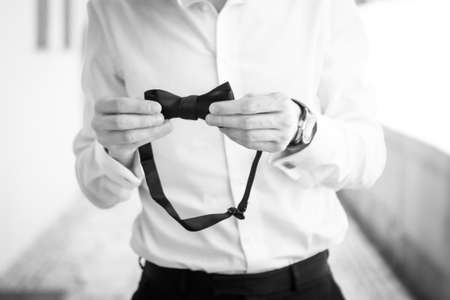 Close-up businessman groom holding bow-tie in his hands. Concept of men stylish elegance clothes