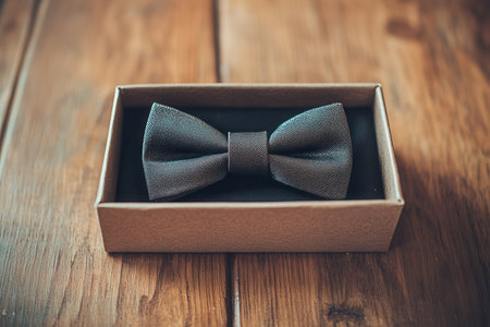 Elegant Black Bow Tie in Brown Box on Rustic Wooden Surface