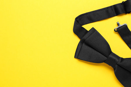 Stylish black bow tie on yellow background, top view. Space for text