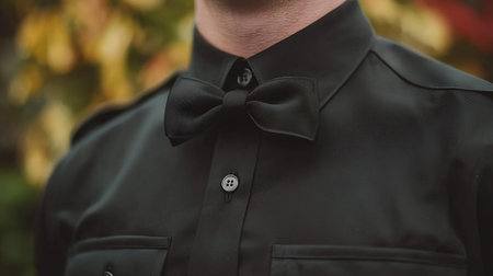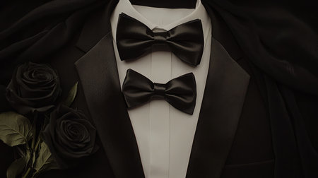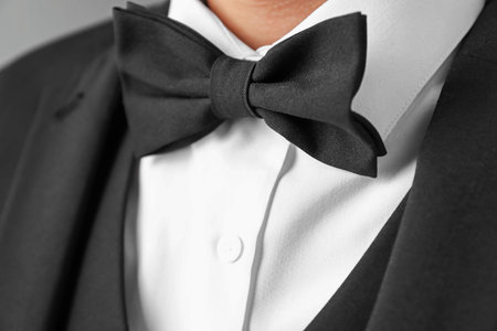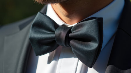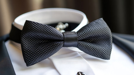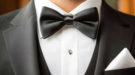 Classic black bow tie with a tuxedo and white shirt, close-up highlighting the polished elegance of formalwear.