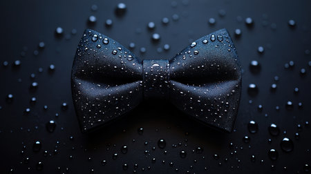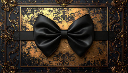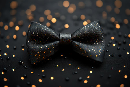 A striking black bow tie is centered against a dark, shimmering backdrop filled with golden specks. This elegant accessory captures attention and embodies refinement, suitable for weddings, parties, or formal events.