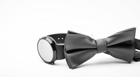 time and fashion. time goes on and fashion does not change. vintage and retro style. time to groom. male bow tie and watch isolated on white. Wedding accessory. Elegant look. copy space.