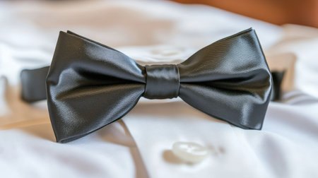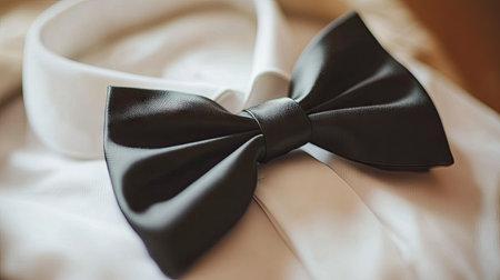 A stylish bow tie in classic black, placed on a crisp white shirt, ready for a formal event.