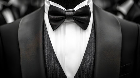 Close-up shot of an elegant tuxedo featuring a classic bow tie and a stylish vest. Perfect for events, weddings, and formal occasions.