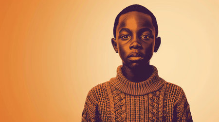 A black African boy in a brown sweater stands before an orange backdrop.