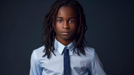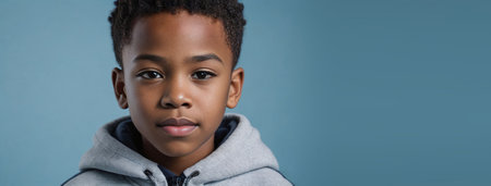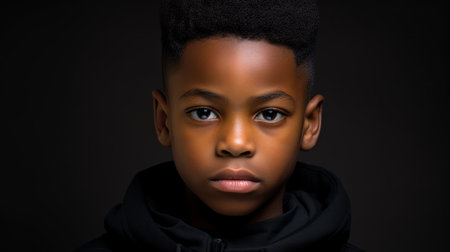 Cinematic closeup portrait of teen African American boy looking at camera with serious face expression copy space