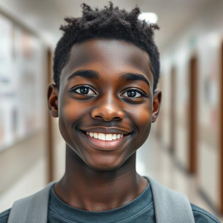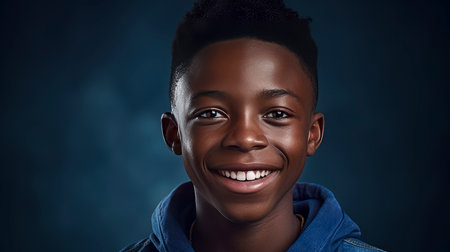 The joyful Afro American boy, around 8-10 years old, smiles brightly against a colorful background, ideal for modern advertising and promotional content