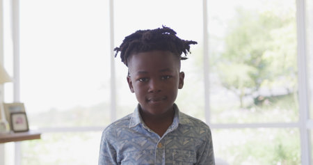 Portrait of African American boy spending time at home, standing in the living room, looking at camera