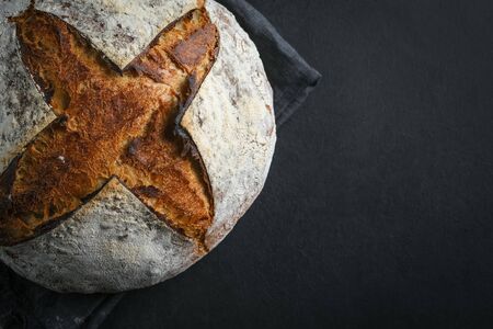 Freshly baked homemade artisan sourdough rye and white flour bread. Sliced. Top view. Close up. Copy space.